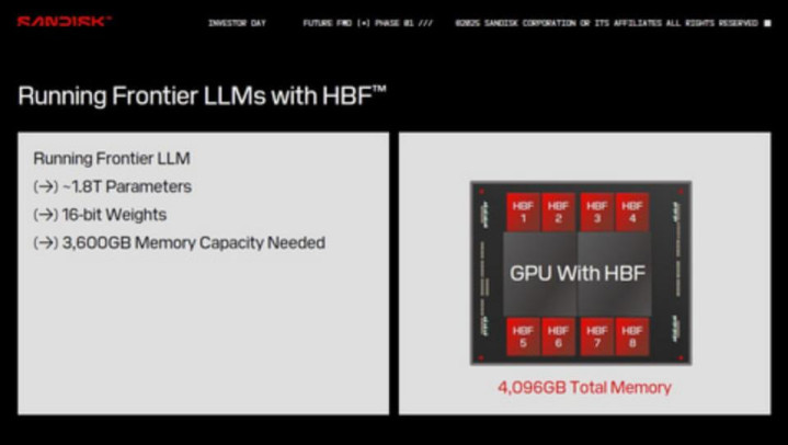 Sandisk 声称,HBF 架构是通过收集几家大型人工智能 (AI) 公司的信息而设计的。大型机器学习模型,例如大型语言模型 (LLM),具有极其庞大的参数数量。例如,该公司表示,存储 1.8 万亿 (1.8T) 个具有 16 位权重的参数需要 3,600GB 的内存。